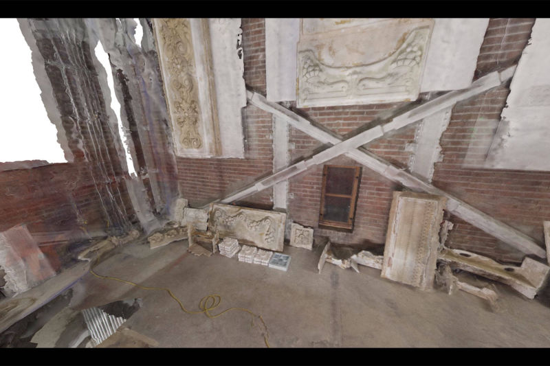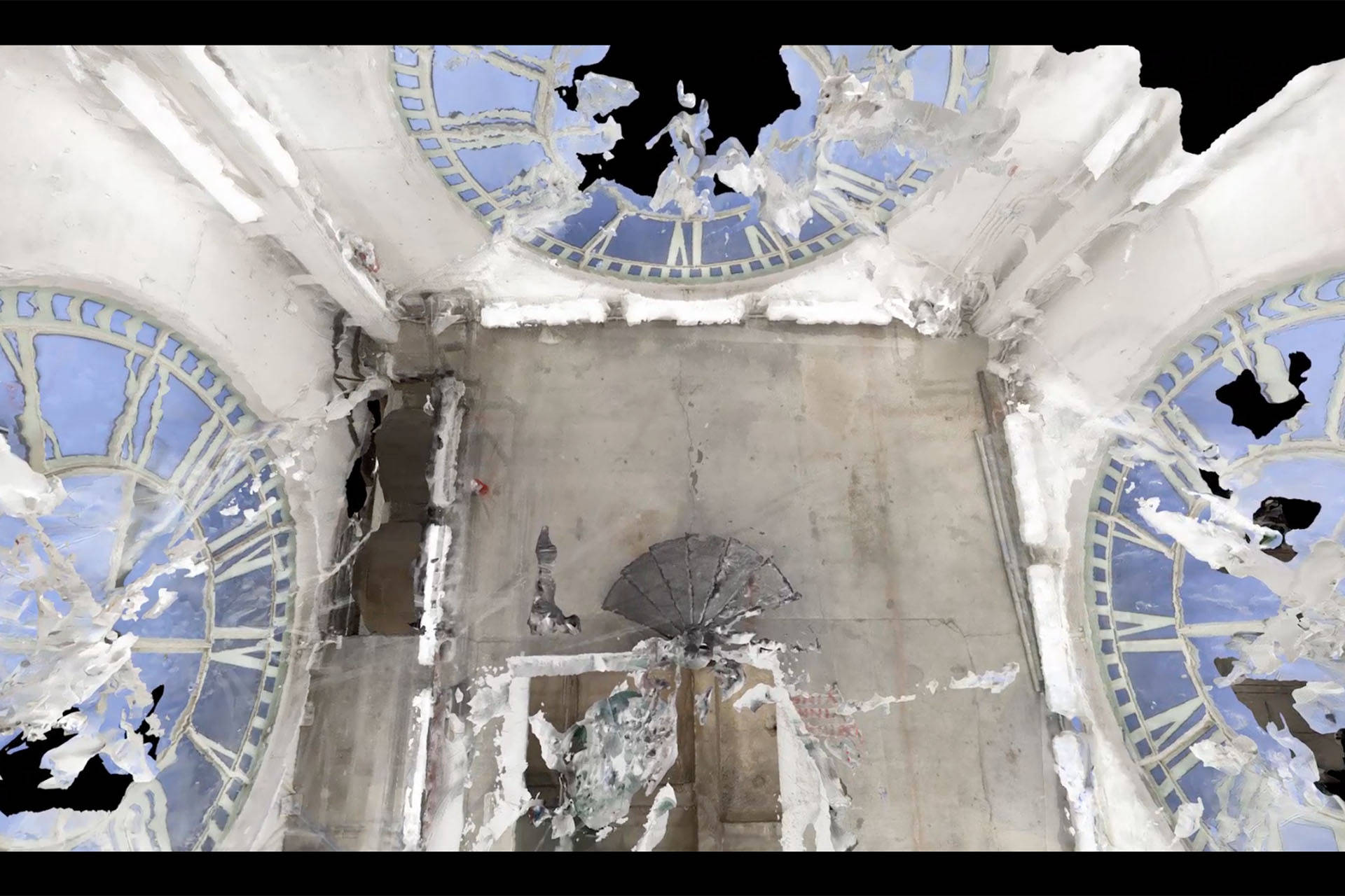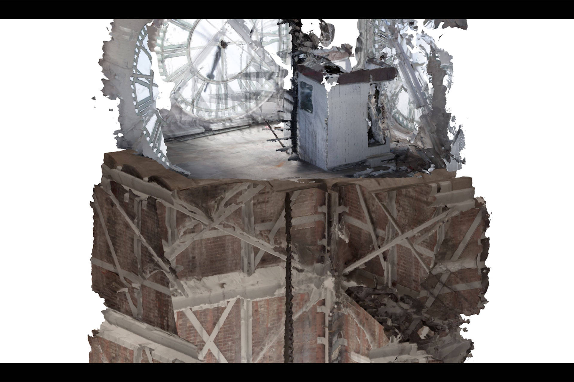 In the installation, a projected video animation alternately ascends and descents the clock tower, exploring the repeated forms and unseen spaces in the otherwise empty structure. Created by taking nearly 2000 photographs of the tower’s interior, the digital animation is interrupted by hollow spaces, glitches, and errors in the modeling process (photogrammetry).