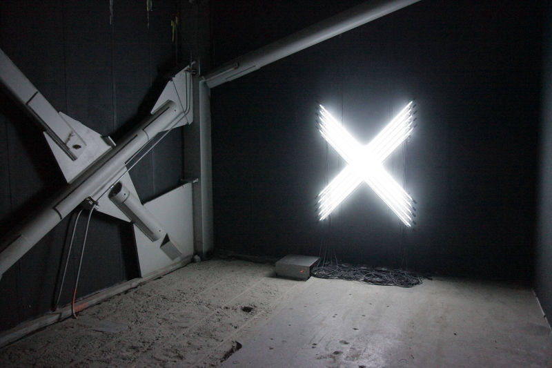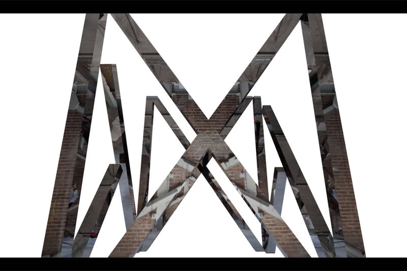 Opposing the video projection, a neon and mirrored glass sculpture echoes the forms and movement seen in the animation.