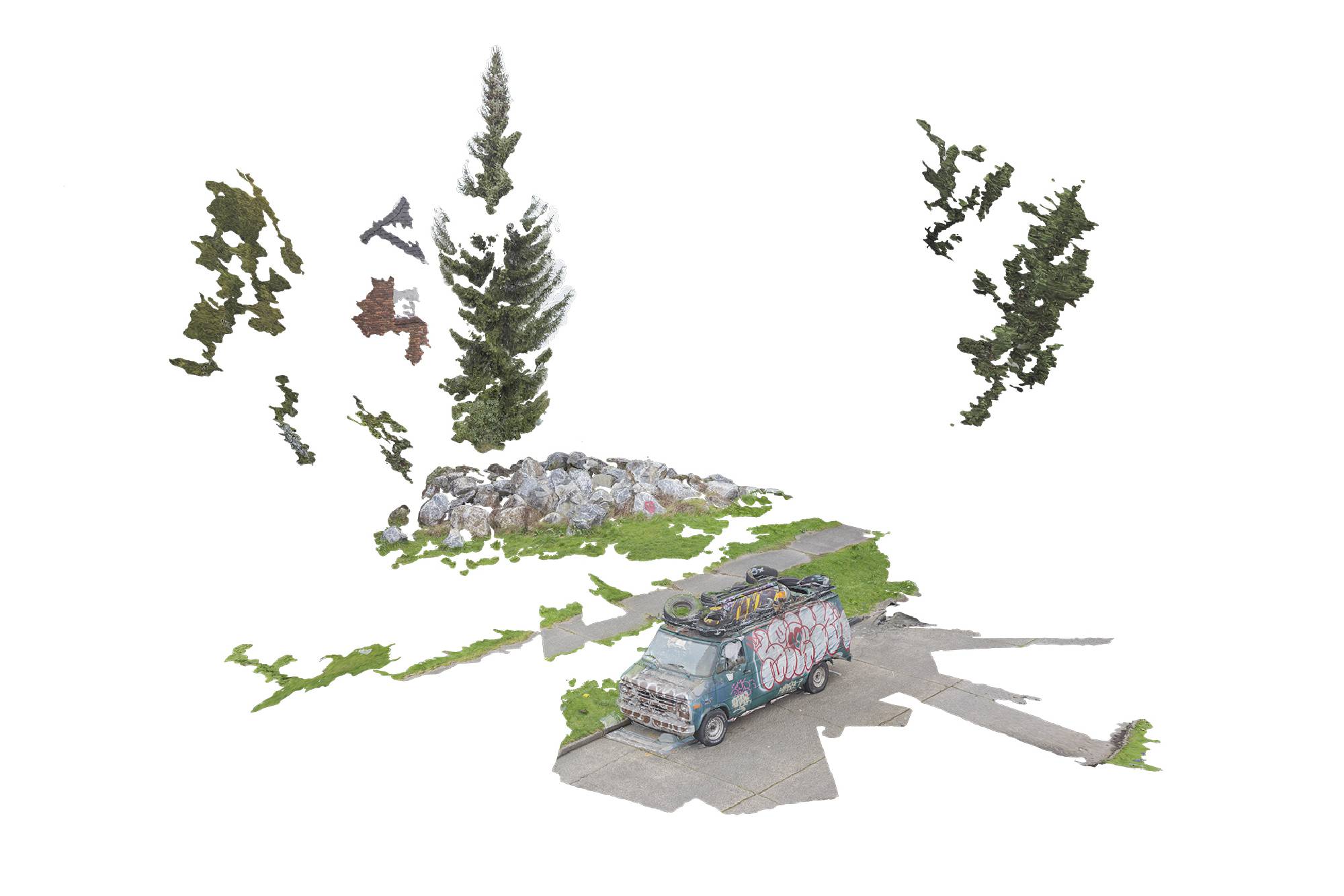In Drone Triptychs, these scenes and locations are explored through a digital process – photogrammetry – which generates a virtual 3D model by analyzing hundreds of two-dimensional photos. In order to access all possible perspectives, many of the photos were captured using a drone, an airborne camera funded by 4Culture’s 2015 Tech Specific grant.