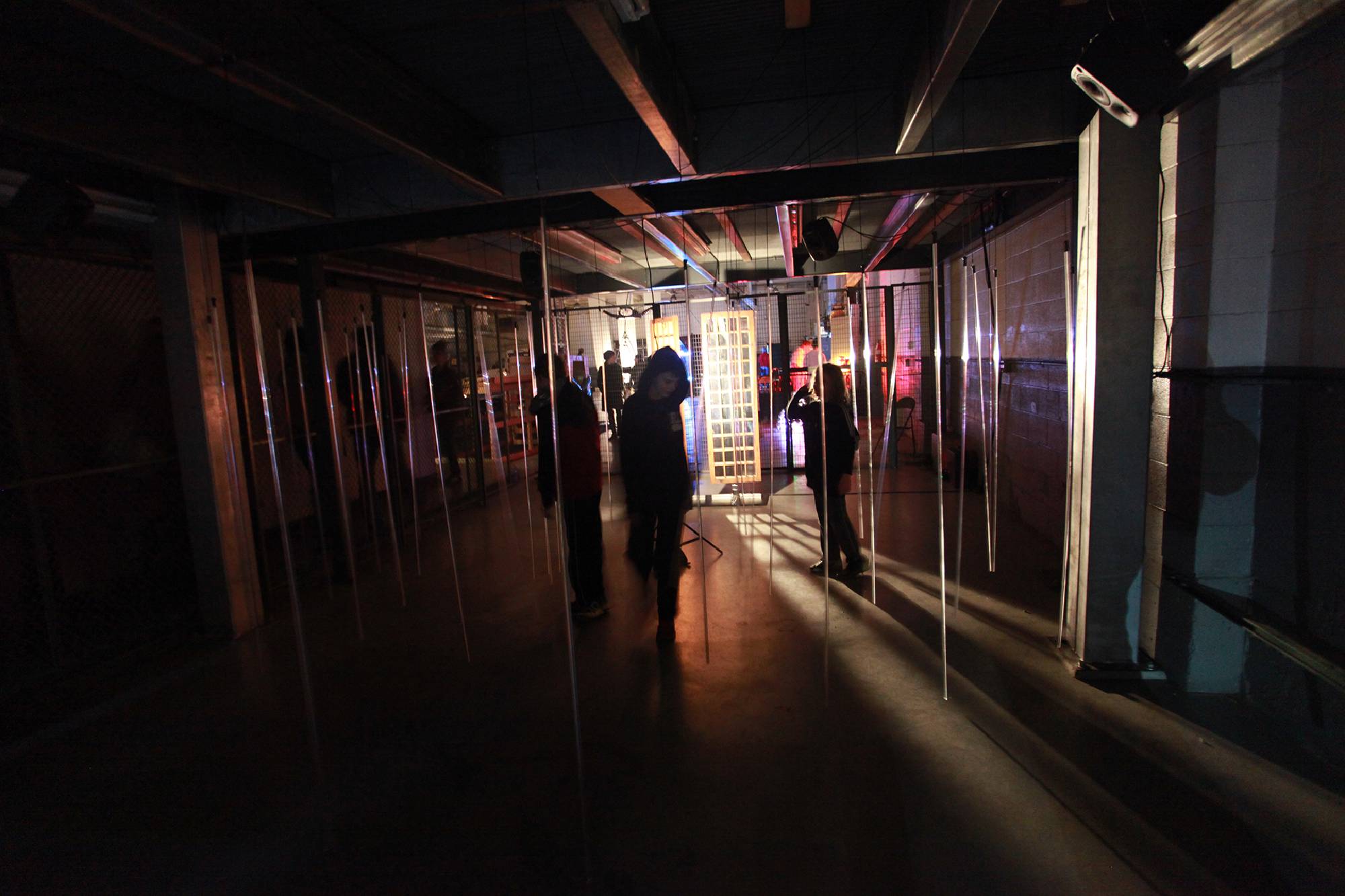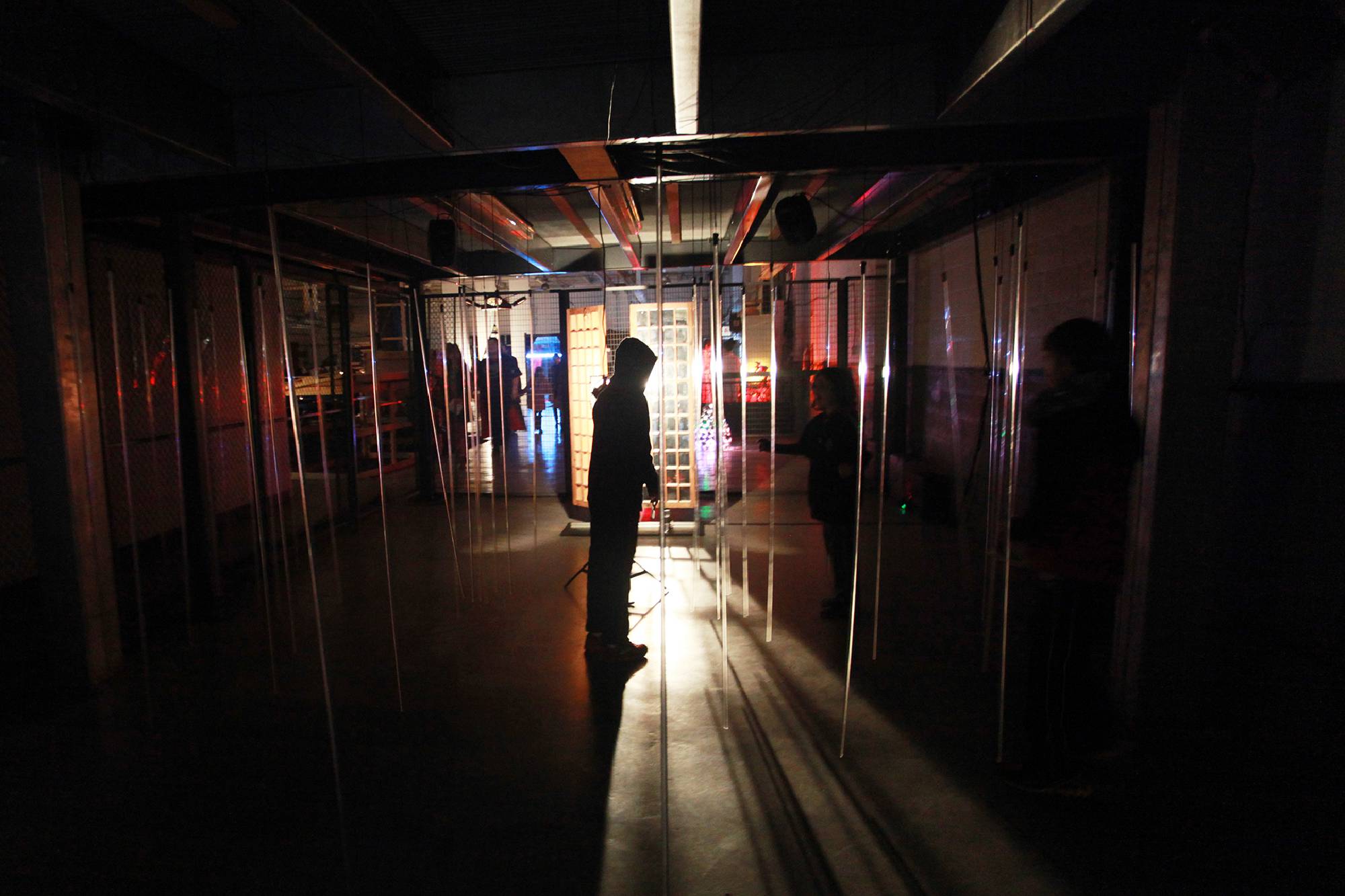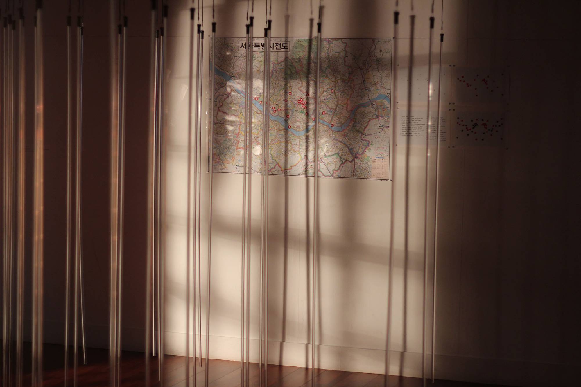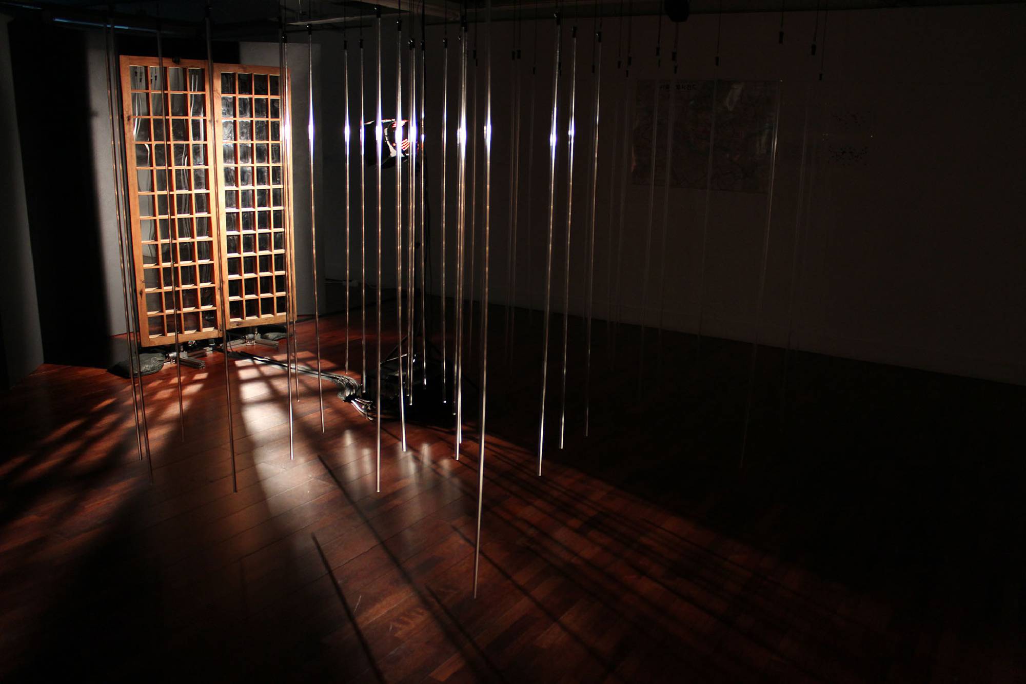 Commissioned for the 12th Seoul International New Media Festival, Unexpected Guests, Returning Ghosts continues a series of projects that explores immediate physical space, the internal space of memory, and the virtual spaces of digital media. While the first version of the installation collected an array of live Internet radio feeds from around the globe, this installation uses an archive of sounds recorded locally throughout Seoul. As light is reflected off a pair of slowly moving mirrored windows, sounds are triggered by an array of light sensors organized throughout the gallery.
