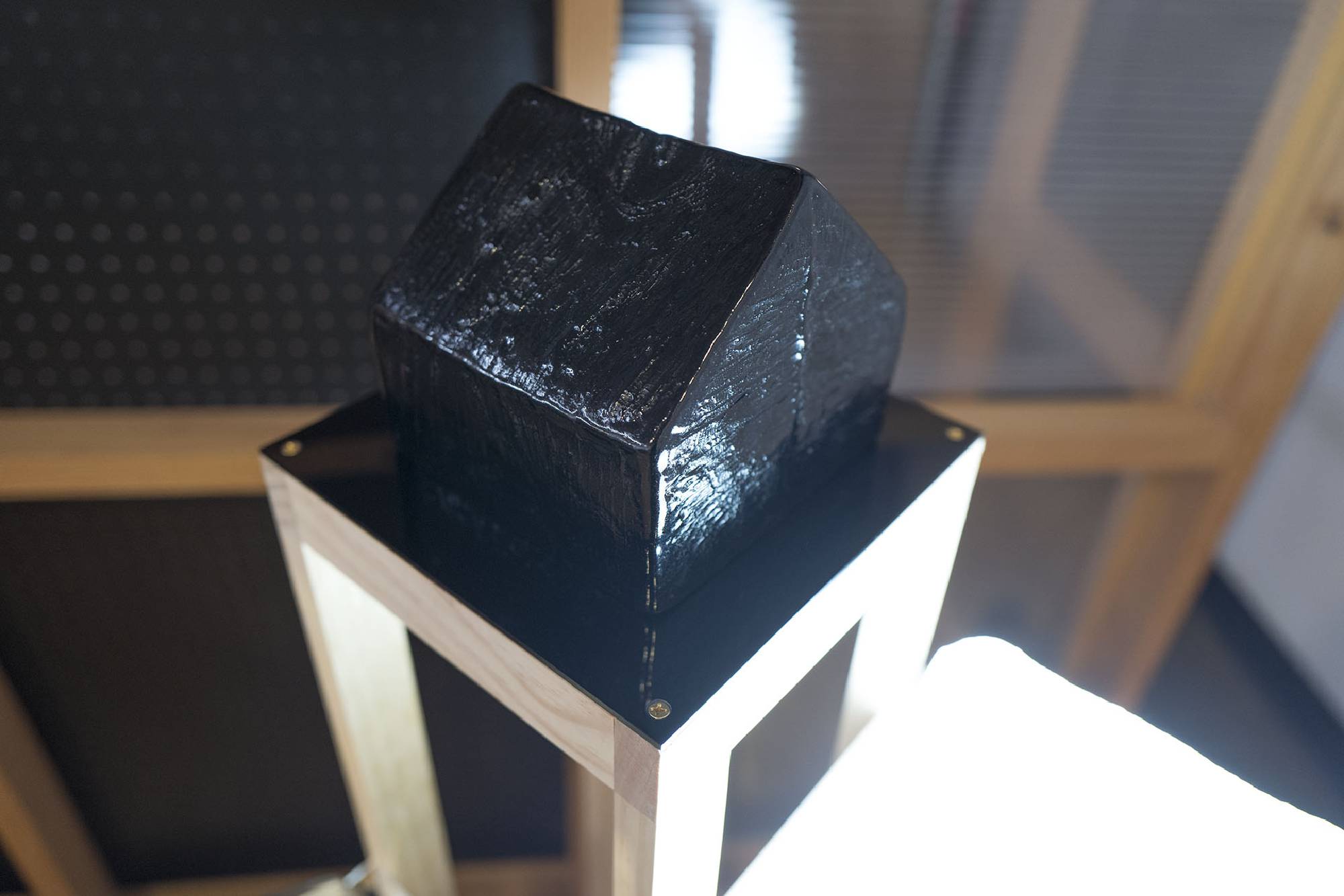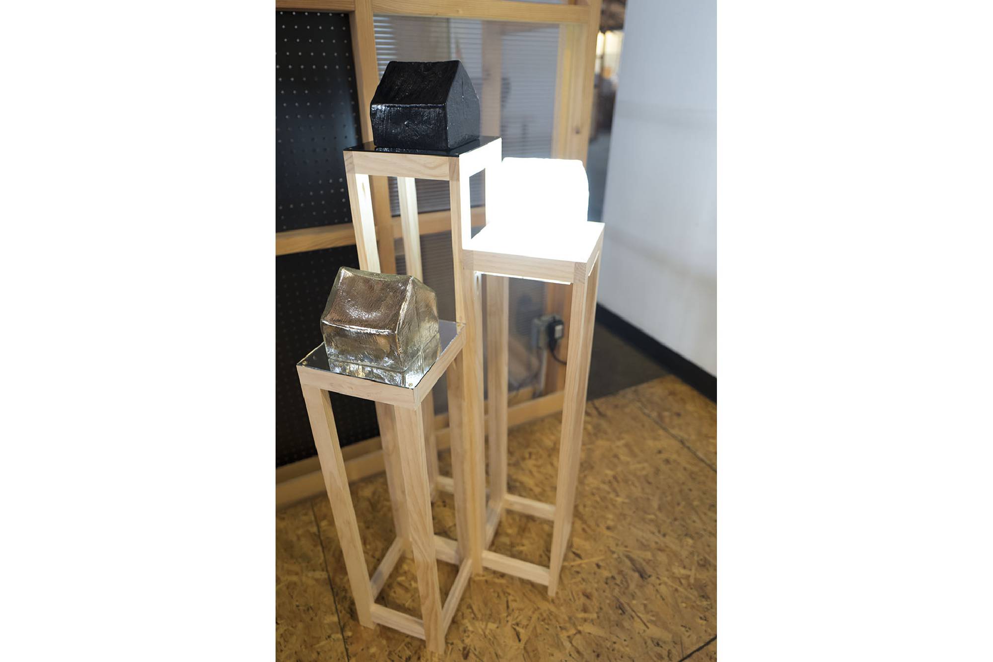 Three Glass Houses were hand-blown during a 2014 residency at Pilchuck School of Glass. One black, one mirrored, and one illuminated house reference the heritage of wooden architecture in the Northwest and echo the materials one encounters on the Pilchuck campus – fire, light, wood, and glass.