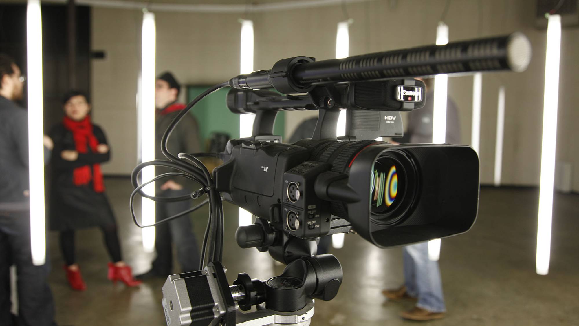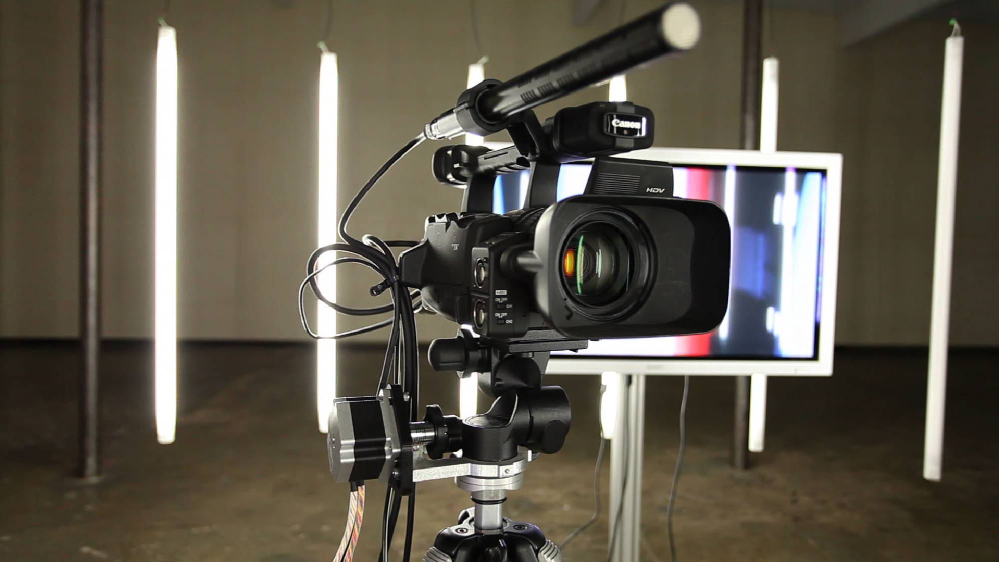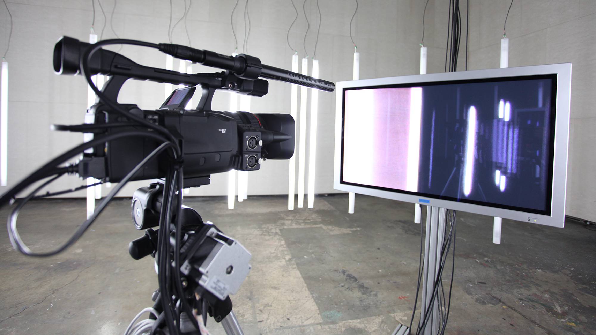 In A Macrocosmic Zero, an automated, moving video camera captures visitors as they pass through a field of dynamic sculptural lighting elements. As live images are embedded and re-circulated through this feedback system, distinct windows of time are eroded and transformed into pulsating masses of light and saturated color. Referring to both Robert Smithson and J.G. Ballard’s writings on entropy, A Macrocosmic Zero explores the crystallization of images in time, in this case through the lens of the video apparatus.