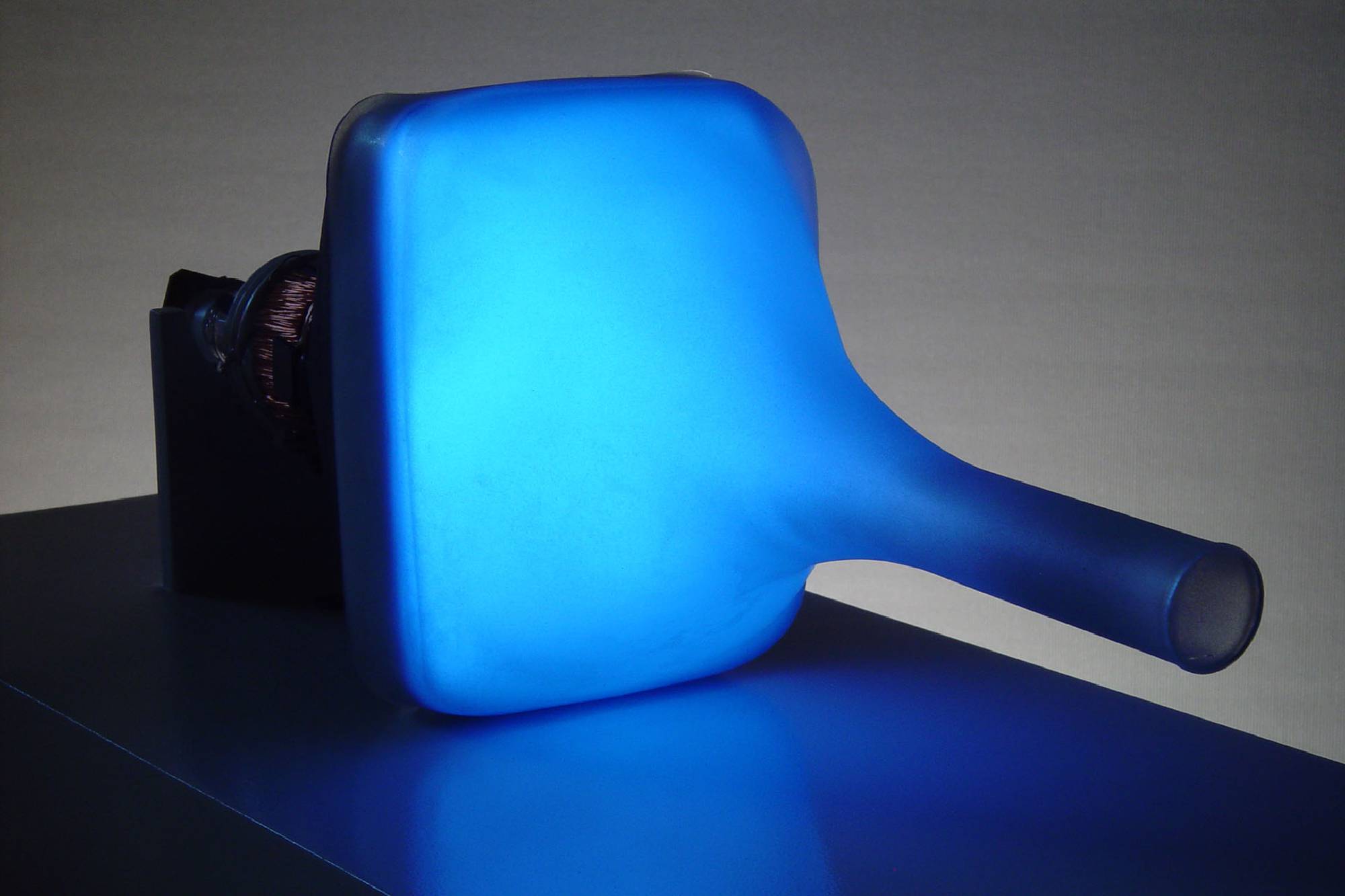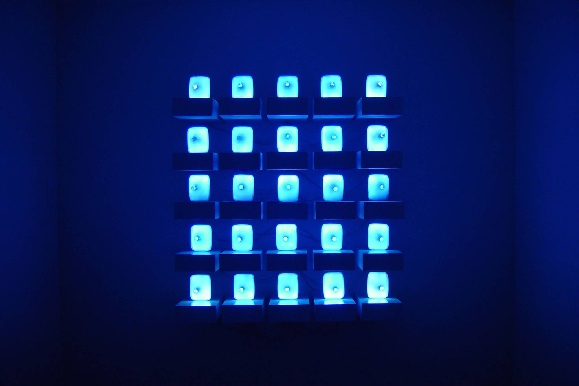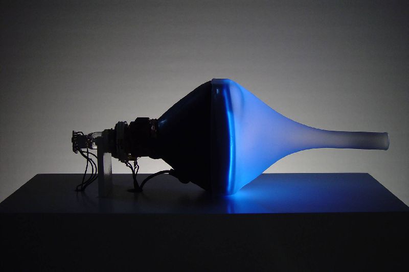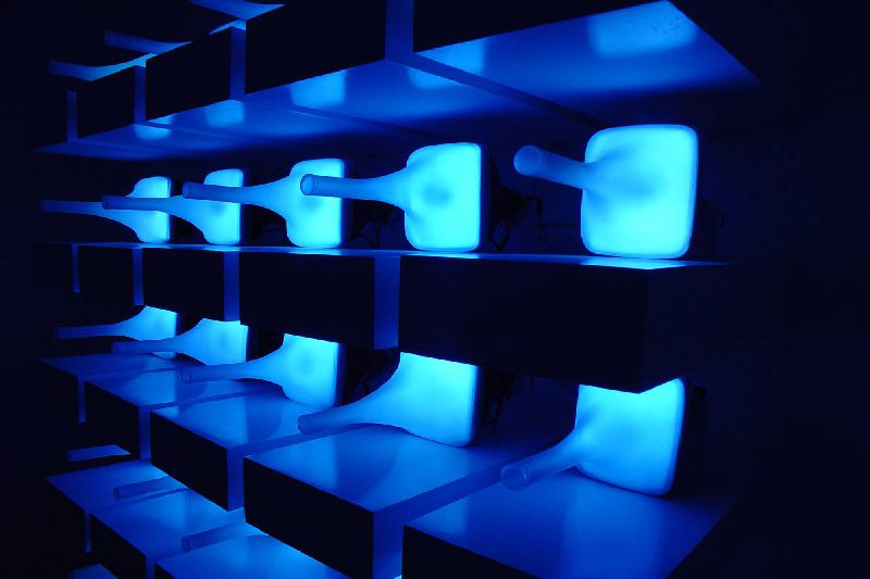 ...Take Philo’s Cave, for example, another display based on naked black and white TV tubes covered with plastic hoods. In the installation, (25) small monitors flicker on a set of vertical wooden shelves. This time we are invited to peek at what’s on TV, since Rice has left a small peephole at the snout of the plastic cover. What we see inside, barely, is a snatch of a Balinese shadow puppet play, created and filmed by the artist. But the puppet show is part of the subliminal message of the piece; what we perceive once we take our eye away from the peephole aren’t puppets and poles, but merely a chorus line of flickers, with a dark horizontal scan line traveling across all five screens at once, again and again, an abstract visual metronome beating time. The title of the piece can be taken on several levels.