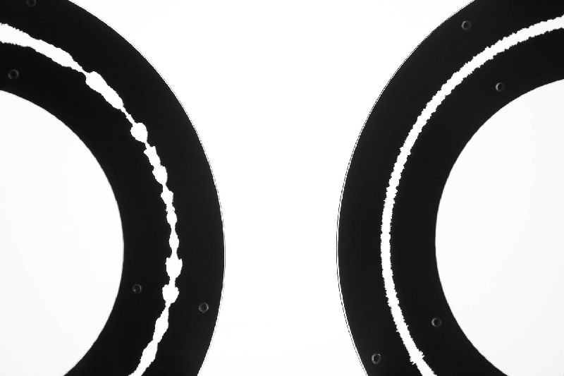 In Rip #4, the discs present two documents of the same event: the simple act of tearing a sheet of paper. While one disc is inscribed with the recorded sound of the paper ripping, the second disc traces the resulting torn edge of the paper. They both attempt to describe the same action, but the inevitable sonic result is…